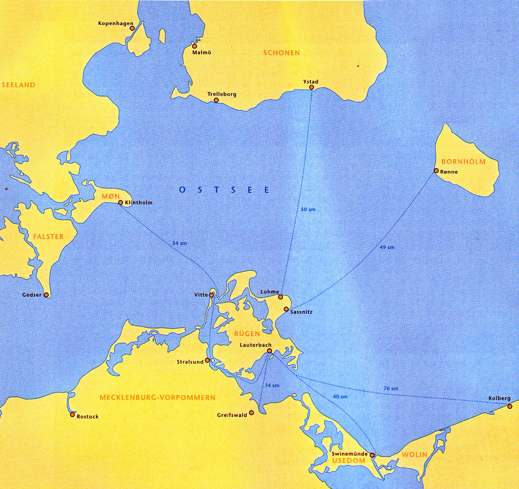 Výchozím místem našich plaveb je německý ostrov Rujána. Vyplouváme obvykle z malebného přístavu Lauterbach v Greichswaldské zátoce a přes kouzelné městečko Sassnitz, kde se neuvěřitelným způsobem prolínají vzpomínky na mondénní mořské lázně z 19. století, kdysi prosperující rybářský přístav a turistické letovisko z dob Honeckrovského východního Německa, doplujeme na ostrov Bornholm.
